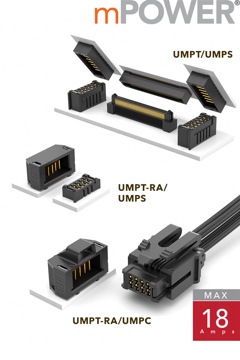 With up to 18 Amps/blade in an ultra micro footprint, mPOWER® connectors provide incredible design flexibility as a power-only system or a two piece system for power/signal applications when used with Samtec’s high-speed connector systems. Micro Mate® and Power Mate® systems feature individually shrouded contacts for electrical and mechanical protection. High power solutions up to 60 Amps/blade feature high density blades in a small form factor, vertical or right-angle orientations, and power-only, power/signal combinations or split power options.